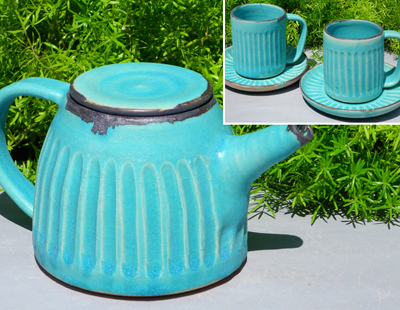 食卓に華やかさを添えるトルコブルーの器。アクセントにブロンズ釉での縁取りが効果的。