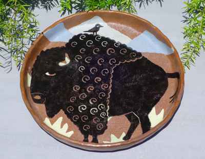 練込み象嵌で施した風景の器に黒の上絵でデフォルメされたバッファロー。一体化された計画的な作品。